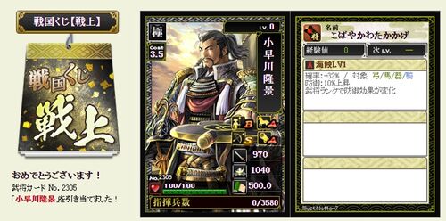 【IXAの話】 合戦休戦日1日目 ブログ記事3回目・・。 なんとなく合成運もくじ運もパッとしない日ですが、最後に戦くじ引いてみます! えっ!?と驚くようなカードを引いて来ないかなぁ~! では行きます・・ぽちっとな!! ◆W9-15 特2枚 ◆影城主 …
